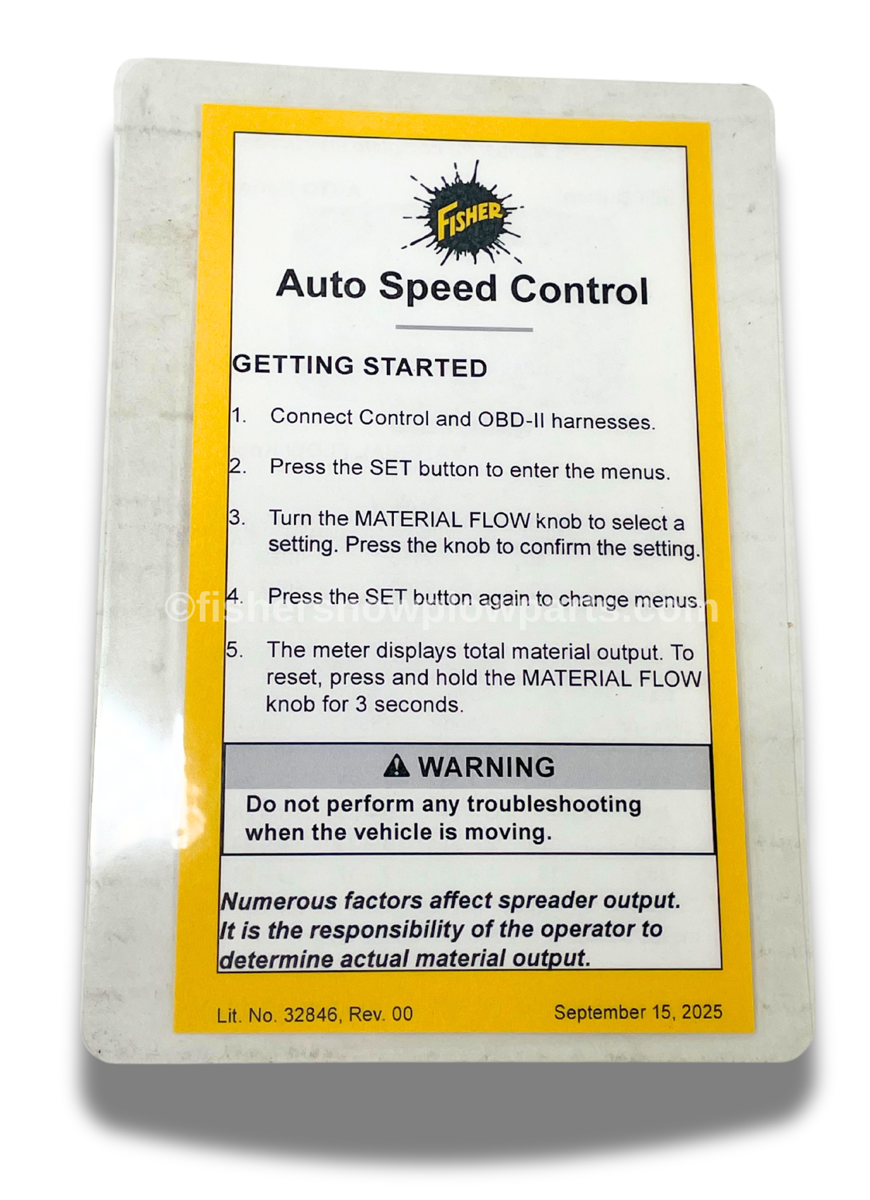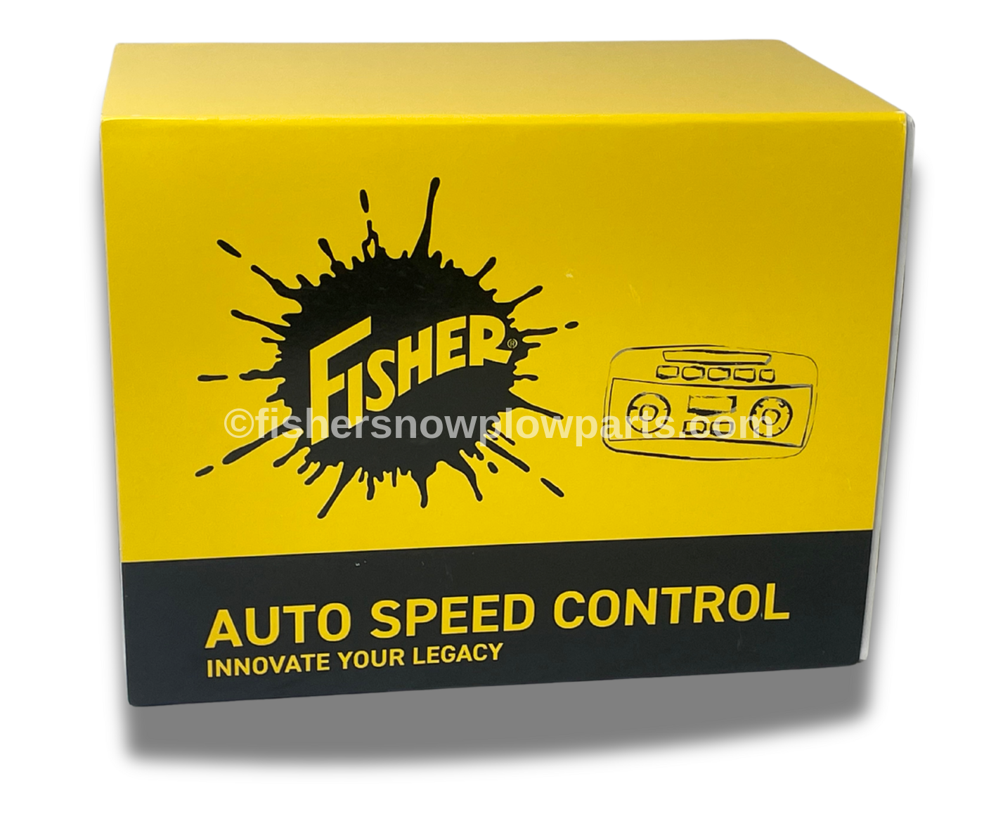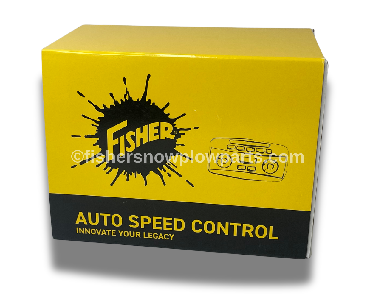 Engineered for precision, the Auto Speed Control is also versatile enough to function with Western Spreaders, featuring the Fisher logo. Its programmable features allow operators to set material spread rates based on lane mileage, ensuring efficient and effective application. The control's unique ability to adjust the spreading speed in real time enhances its functionality, automatically synchronizing material flow with the vehicle's speed, thus minimizing waste and maximizing performance.