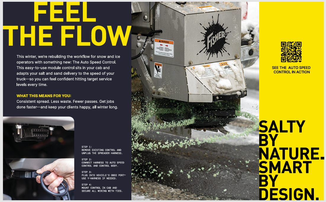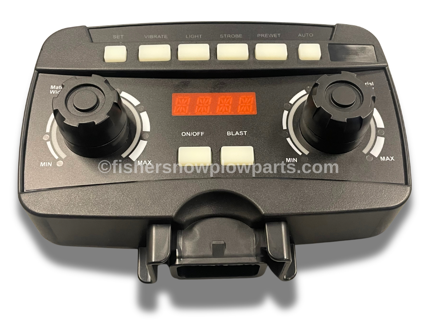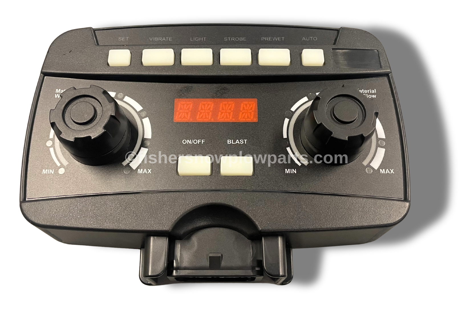 Engineered for precision, the Auto Speed Control is also versatile enough to function with Western Spreaders, featuring the Fisher logo. Its programmable features allow operators to set material spread rates based on lane mileage, ensuring efficient and effective application. The control's unique ability to adjust the spreading speed in real time enhances its functionality, automatically synchronizing material flow with the vehicle's speed, thus minimizing waste and maximizing performance.
