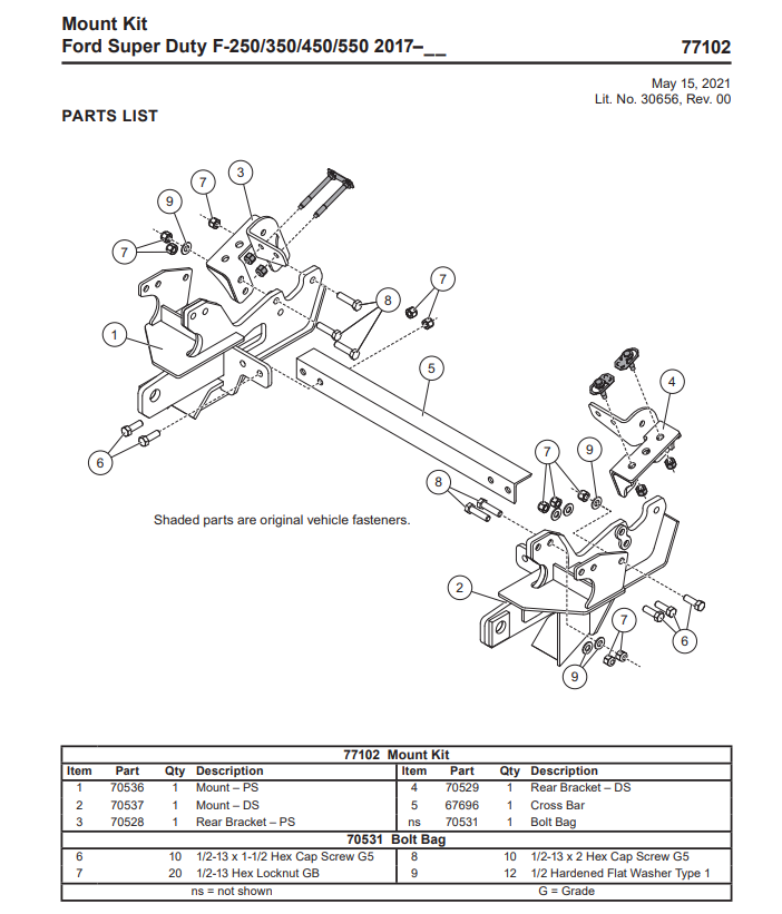 The 77102 Fisher Snowplows Genuine Vehicle Mount Kit is engineered specifically for the 2017 to current year Ford Super Duty series, including F250, F350, F450, F550, and F600 models. This robust mount kit provides the essential foundation for attaching your Fisher snowplow, ensuring a secure and reliable connection. Designed with precision and attention to detail, this mounting kit guarantees compatibility and optimal performance with your vehicle.