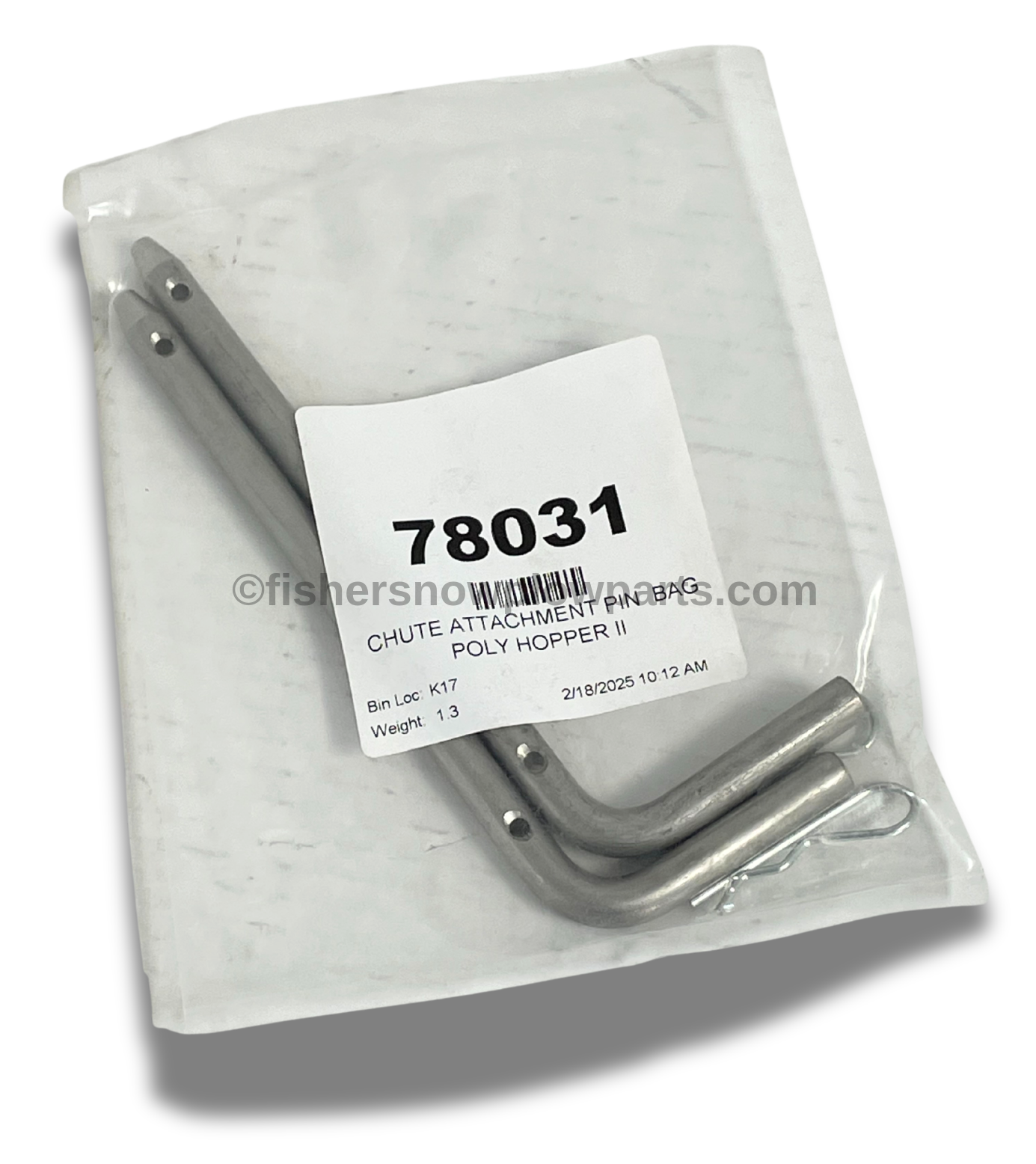 The 78031 Chute Attachment Pin Bag is an essential replacement component designed for a variety of Hopper spreaders, including the Fisher Tempest, Polycaster, Steel-caster series, Western Tornado, Striker & Marauder, and the SnowEx Renegade. This genuine part ensures that your spreader operates at peak efficiency, making it a vital addition for anyone committed to maintaining their equipment.