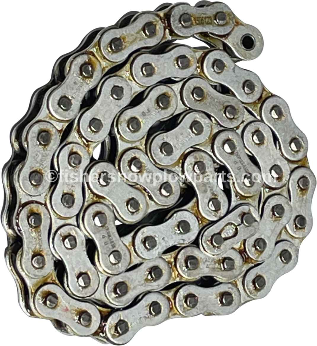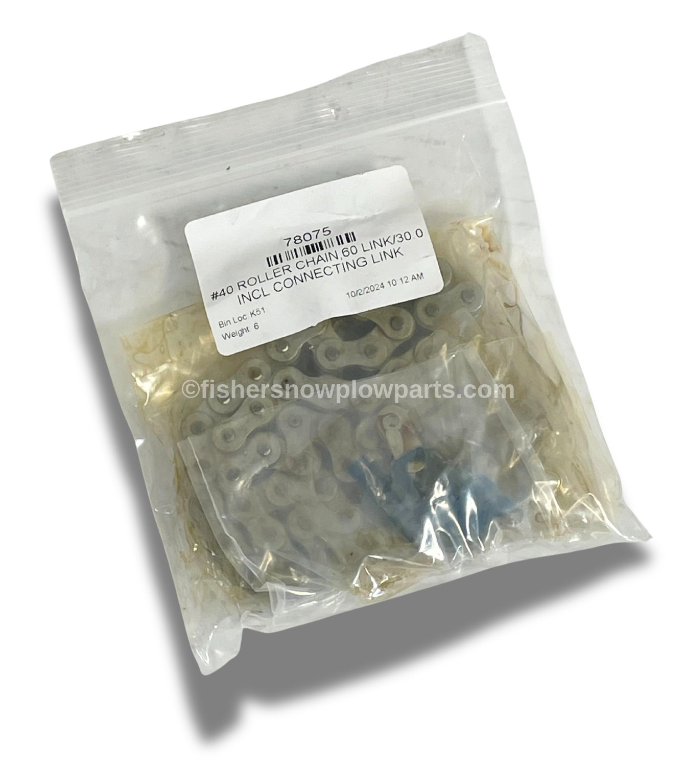 The 78075 Fisher Polycaster, Western Tornado, Blizzard Ice Chaser Spreader Factory Genuine Replacement Part is an essential component designed to keep your spreading equipment operating at peak performance. This high-quality replacement features a #40 roller chain with a total of 60 links, measuring 30.0 inches in length. Designed for durability and reliability, this roller chain includes a connecting master link, ensuring a seamless installation process.