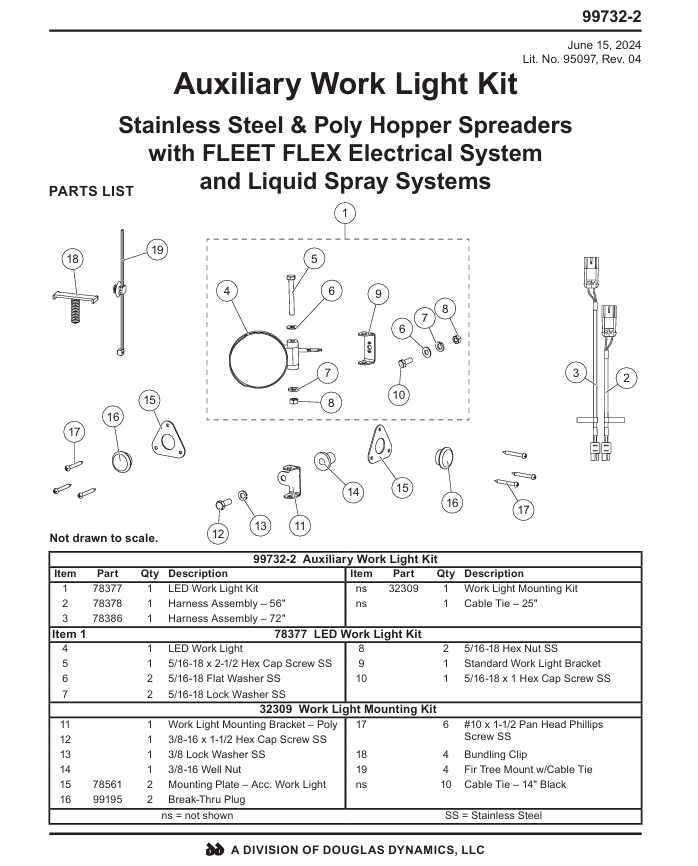 Enhance your FISHER, WESTERN, or SNOWEX FLEETFLEX Hopper Spreader with the 99732-2 Secondary LED Work Light Kit. This genuine accessory is designed to improve visibility during nighttime operations, ensuring you can work safely and efficiently.